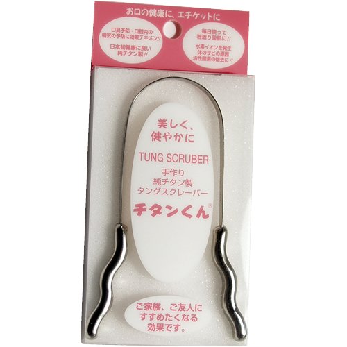 チタンくんは名前のとおり純チタン製。 チタンは、活性酸素を消去する水素を出す力があるから、チタンが持つ水素イオン放出作用でお口の中もイキイキ♪そして健康増進にも効果大。